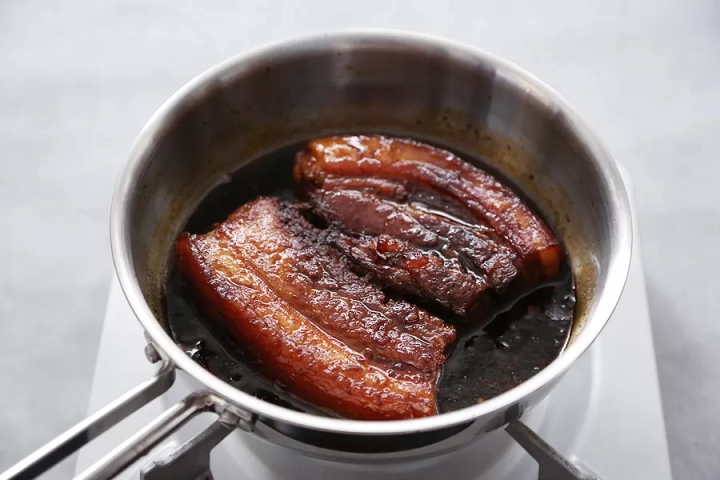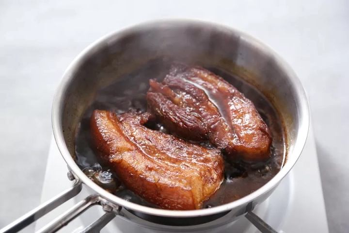 양념장을 삼겹살에 끼얹어주면서 졸여주세요.
