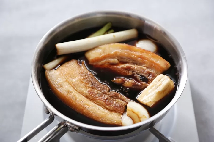 향신재료에 통삼겹, 양념재료들을 모두 부어주고