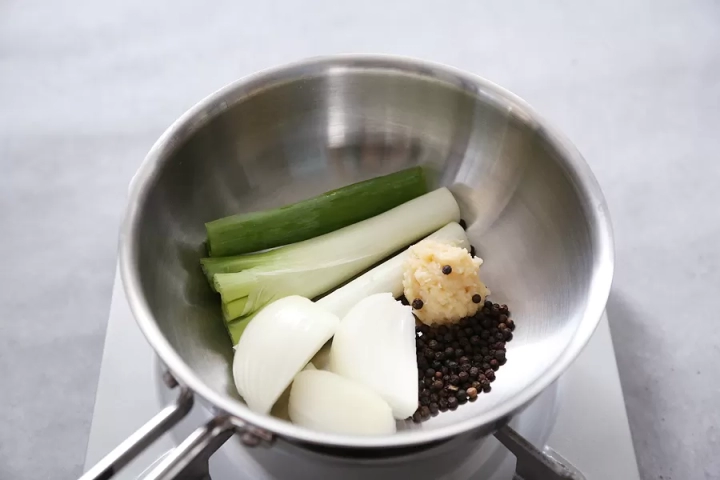 냄비에 대파, 양파 다진마늘, 통후추, 생강을 넣어주세요.