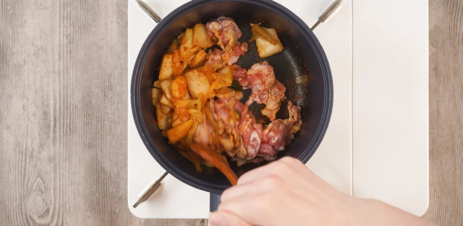 돼지고기 앞다리살을 넣고 함께 볶아주세요.