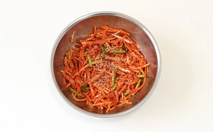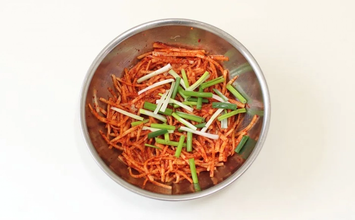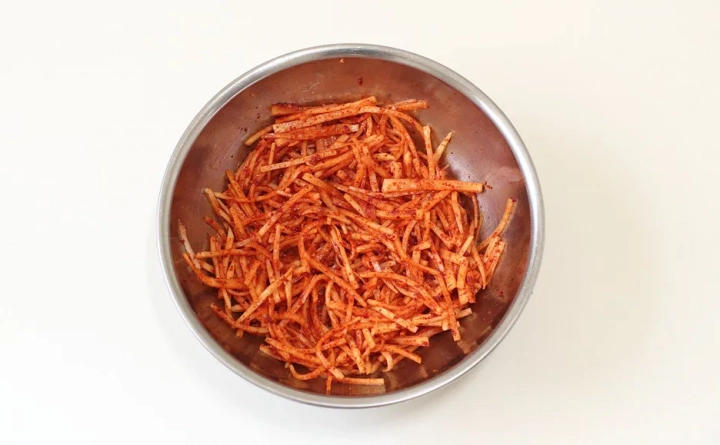 무채에 소금 1작은술을 더해 고르게 섞으며 버무려주세요.