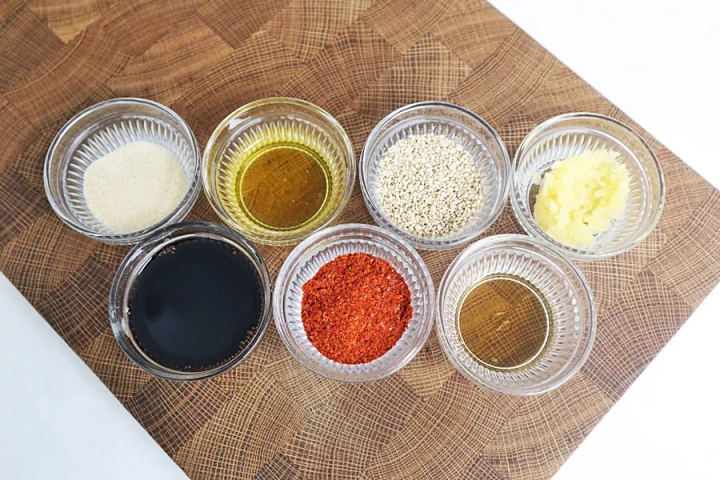 [양념재료]: 설탕 1큰술, 고춧가루 2큰술, 간장 5큰술,