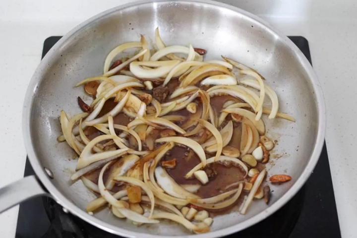 양념장이 골고루 풀어지면 양파를 넣고 볶아주세요.