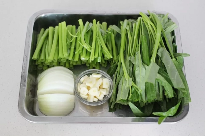 [재료]: 공심채 200g,양파 1/2개, 통마늘 5개,