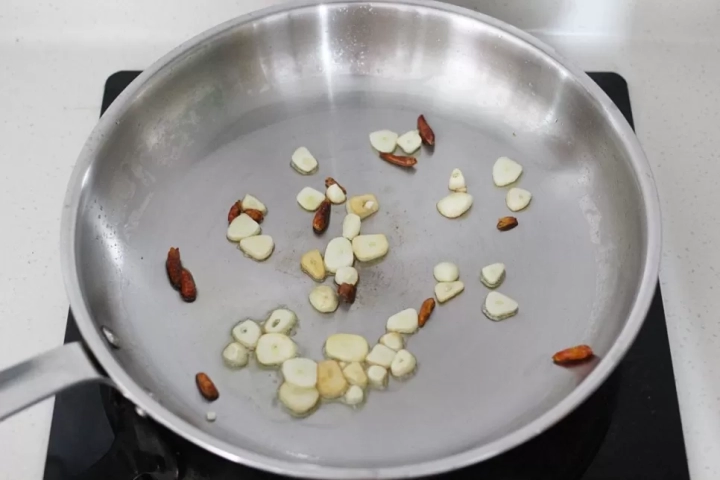 달군 팬에 기름을 두르고 다진마늘과 페퍼론치노를 볶아주세요.