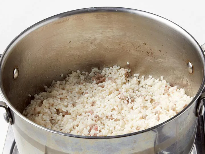 소고기와 쌀을 넣어 2분간 저어가며 볶아주세요.