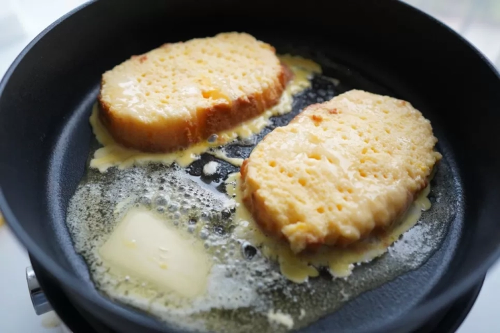 버터가 녹으면 카스테라를 약불로 천천히 구워주세요.