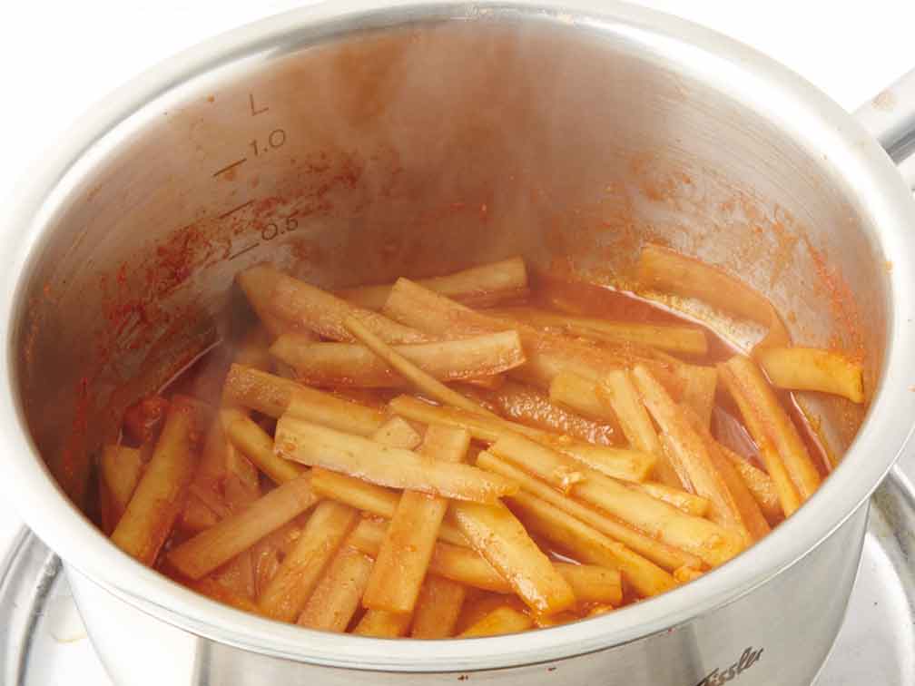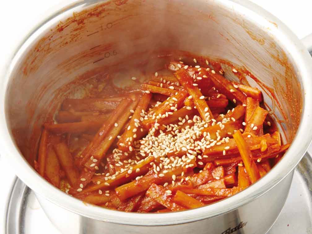 중불에서 우엉이 무르 익으면 양념장을 넣고 졸여주세요.