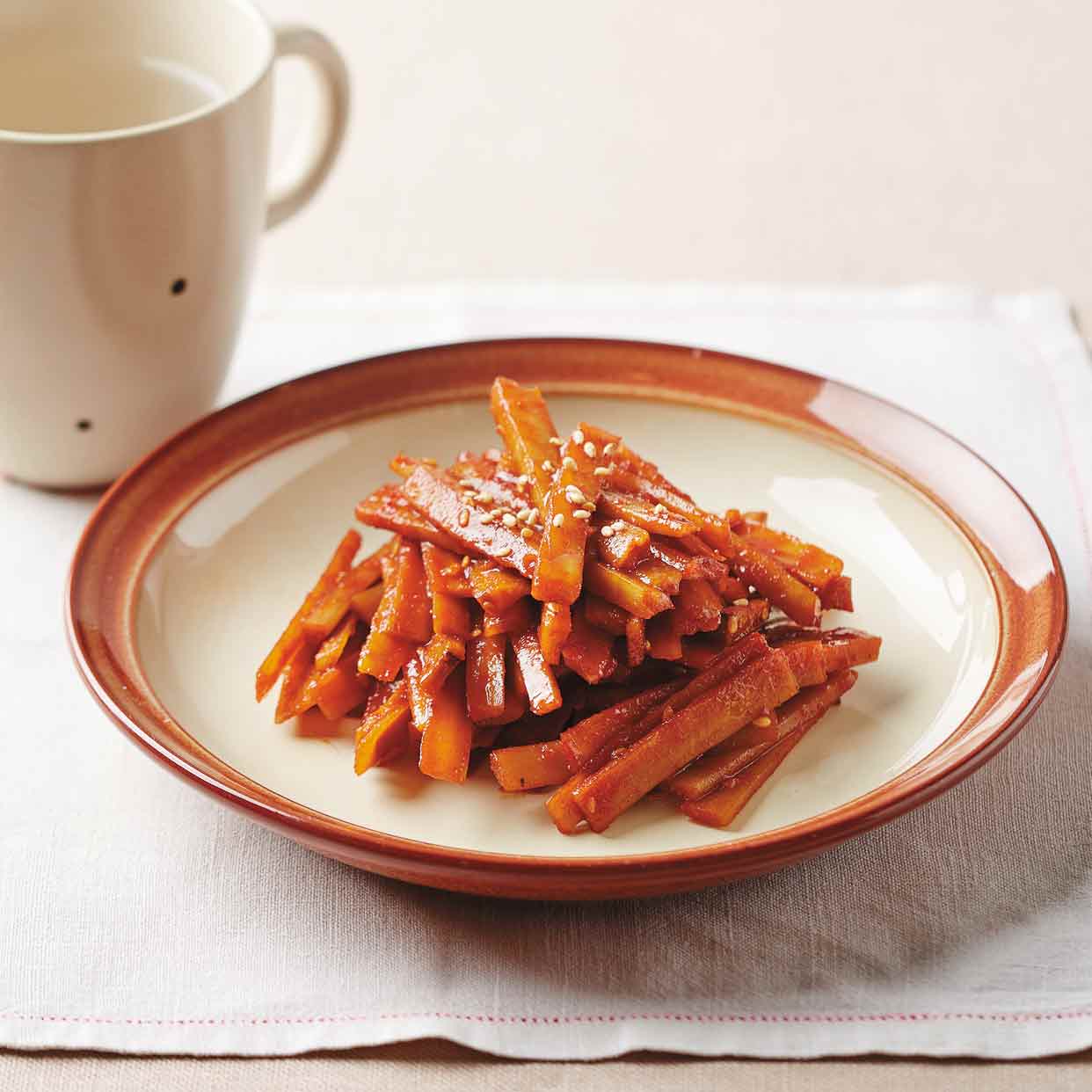 [재료]: 우엉 200g, 올리고당 1큰술, 참깨 약간