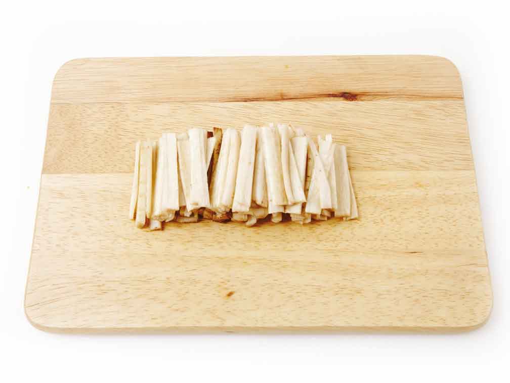 우엉은 세로로 반 갈라 적당한 길이로 납작하게 썰어주세요.