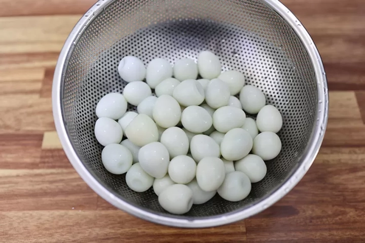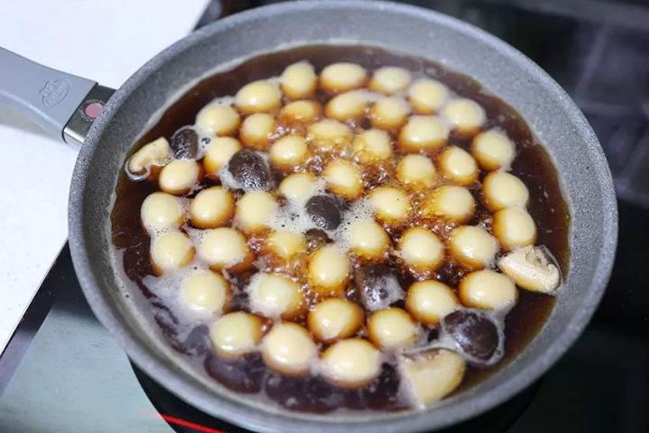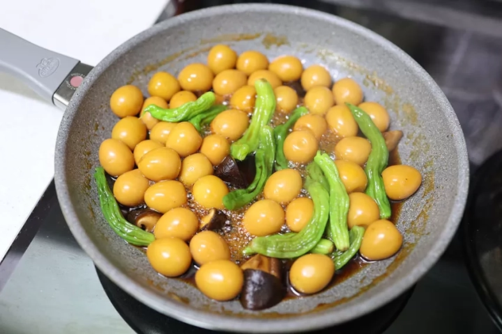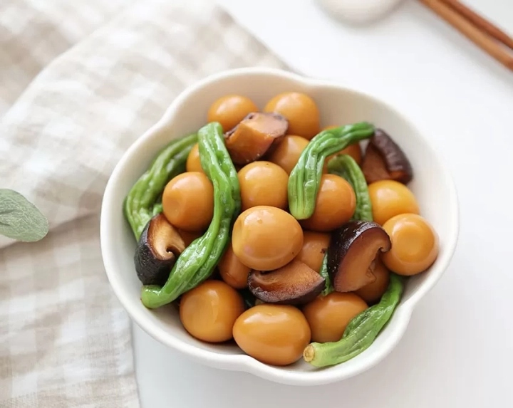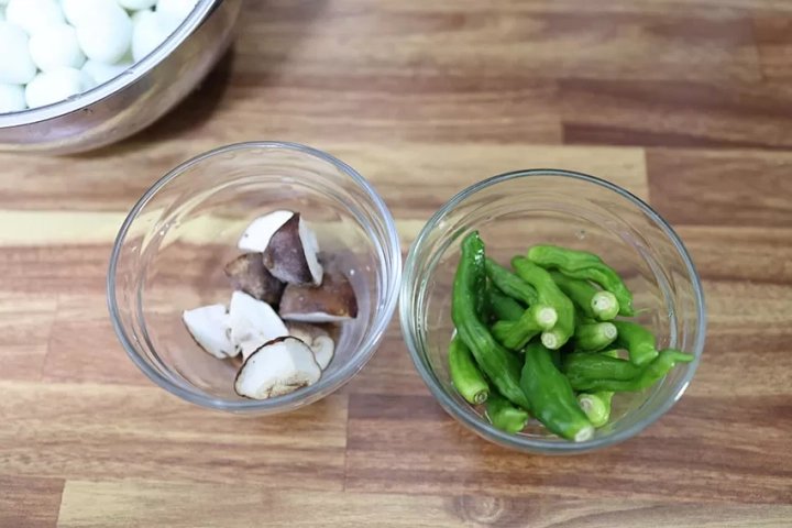 [재료]: 메추리알 50개, 꽈리고추 10개, 표고버섯 2개,