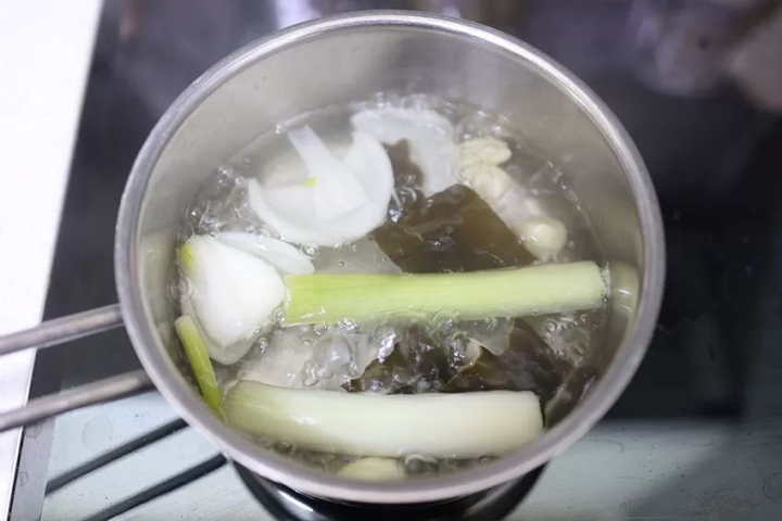 양파, 마늘, 대파, 건다시마를 넣고 보글보글 끓여주세요.