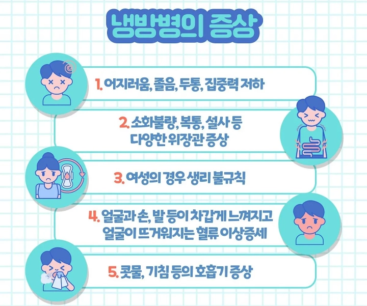 과도한 냉방으로 체온이 내려가 면역력이 떨어지면 감기나 장염에 취약해지며 에어컨이나 가습기에서 서식하는 레지오넬라 균에 감염되었을 경우에는 고열, 감기증상, 폐렴증상, 구토, 설사, 근육통 등이 나타날 수 있다고 하는데요. 냉방병과 감기는 유사한 부분이 많다고 합니다. 그러나 감기의 경우 호흡기 증상을 중심으로 발열, 오한, 두통 등의 증상이 나타난다면 냉방병은 호흡기 증상보다는 식욕저하, 소화불량, 무력감과 같이 전신에 걸쳐 증상이 나타난다고 합니다. 그 중 몸살과 두통, 근육통은 냉방병의 가장 두드러진 증상이라고 하는데요. 냉방병은 뇌의 혈류량이 감소되어 두통이 발생하고 어지럽고 졸리거나 근육수축에 불균형이 일어나 근육통이 발생할 수 있다고 합니다. 또한 장 운동의 변화로 소화불량, 복통, 설사 등 다양한 위장관련 증상이 동반되기도 하며 여성의 경우 호르몬 이상으로 생리가 불규칙해지거나 생리통이 심해지기도 한다고 합니다. 이밖에도 혈류의 변화로 인해 얼굴과 손, 발 등에 냉감을 느끼거나 얼굴이 화끈거리고 가슴이 두근거리기도 하며 체내에서 열을 보충하기 위해 계속해서 생산하기 때문에 쉽게 피로를 느낀다고 합니다.