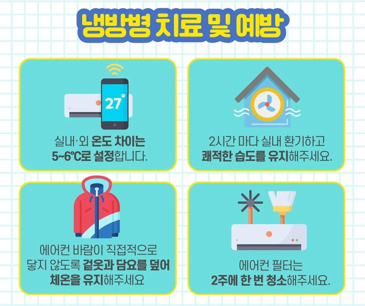 냉방병을 예방하기 위해서는 실내온도를 섭씨 24~28도 정도로 설정하고 실내외 온도차를 5~6도 안팎으로 유지하며 최소한 1시간 간격으로 창문을 열어 환기를 시키는것이 좋다고 하는데요. 또한 '레지오넬라' 세균 번식을 막기 위하여 2주에 한번씩 정기적으로 냉방기를 점검하고 필터를 청소하여 냉방기 청결을 유지해야 한다고 합니다.