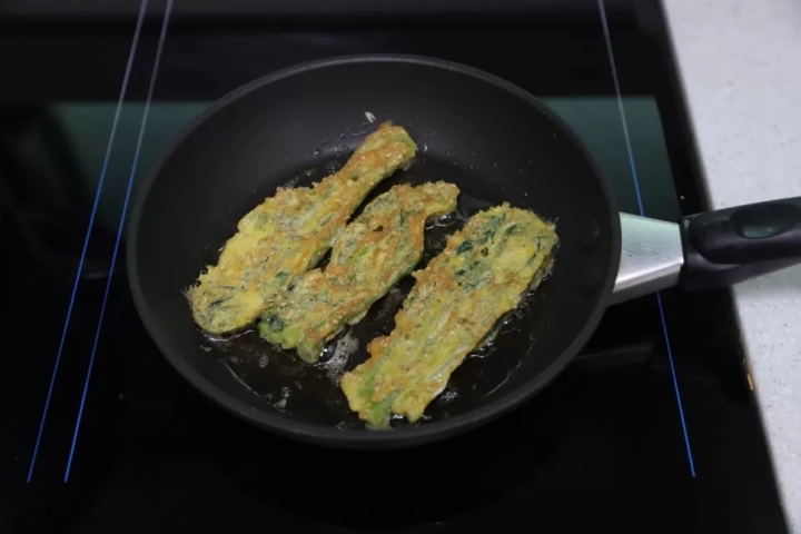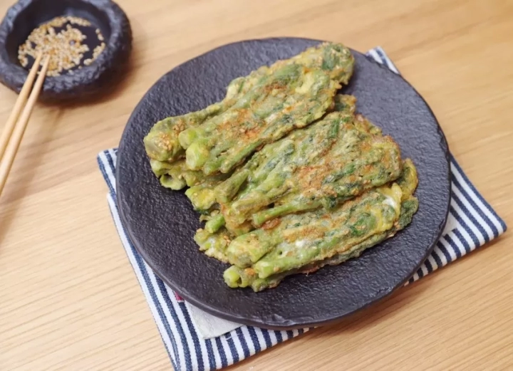 달군 팬에 달걀물을 충분하게 입힌 두릅을