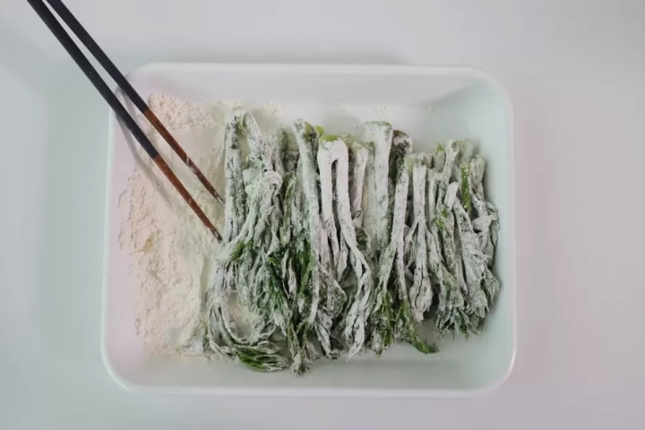 물기 제거한 두릅에 부침가루를 골고루 묻혀주세요.