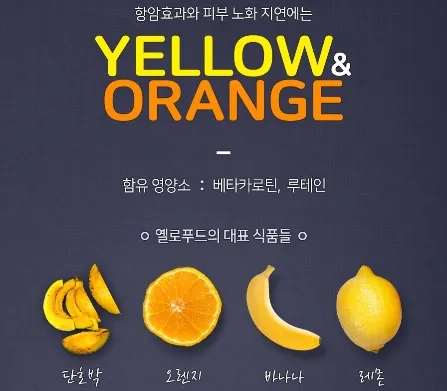 부종으로 인한 하체비만이거나 평소 음식을 짜게 먹는 사람에게 더없이 좋은 것이 옐로푸드라고 하는데요. 풍부하게 함유된 칼륨이 나트륨을 배출시키고 몸의 쓸데없는 수분이 빠져나가도록 돕고 또한 베타카로틴과 루테인 성분이 인체의 면역력을 높여주어 항암, 항산화, 노화예방에도 효과가 있다고 합니다. 호박, 옥수수, 바나나, 잣 등이 대표적인 옐로푸드라고 합니다.