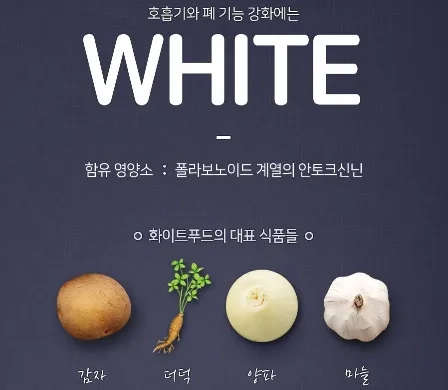 사계절 내내 감기를 달고 살거나 바이러스에 약한 사람이라면 화이트푸드를 즐겨 먹어야 한다고 하는데요. 주요 성분인 플라보노이드가 바이러스와 세균에 대항하는 저항력을 길러주며 또한 강력한 항암작용을 하기 때문에 암과 같은 성인병 예방에 특히 우수한 식품이라고 합니다. 마늘, 양파, 무, 인삼 등이 대표적인 화이트푸드라고 합니다.