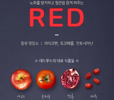 어혈이 많은 사람은 특히 레드푸드에 주목해야 한다고 하는데요. 레드푸드에 들어 있는 대표적 성분인 리코펜이 괴산화 지질의 생성을 막아 혈관을 부드럽게 해주기 때문에 혈액이 잘 흐르게 된다고 합니다. 또한 안토시아닌, 폴리페놀 등 성분은 심장의 기능을 강화하는 탁월한 효능이 있으며 면역력을 강화시켜주며 소화흡수력이 좋고 식이섬유가 풍부하여 다이어트에도 도움을 준다고 합니다. 토마토, 붉은 자몽, 수박, 딸기, 구아바 등이 대표적인 레드푸드라고 합니다.