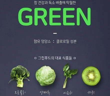 그린푸드는 장이 건강하지 않거나 변비에 시달리고 있는 담음체질 사람에게 특히 좋다고 하는데요. 최고의 천연 해독제로 알려진 클로로필 성분이 몸속의 각종 유해 찌꺼기를 배출시켜 준다고 합니다. 또한 신진대사를 원활하게 만들어주기 때문에 다이어트에도 효과가 있으며 안색을 맑게 하는데도 도움이 된다고 합니다. 녹차, 상추, 매실, 시금치, 브로콜리 등이 대표적인 그린푸드라고 합니다.