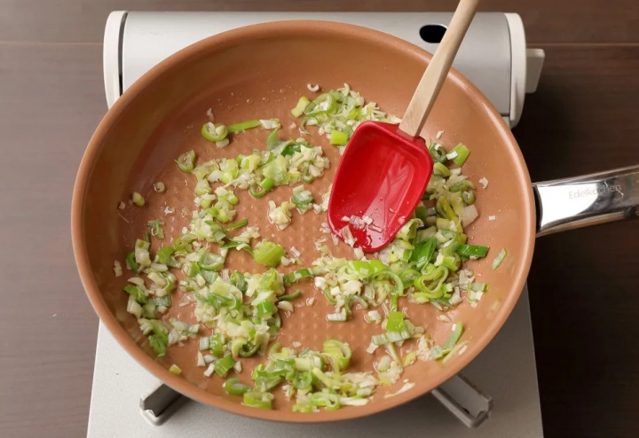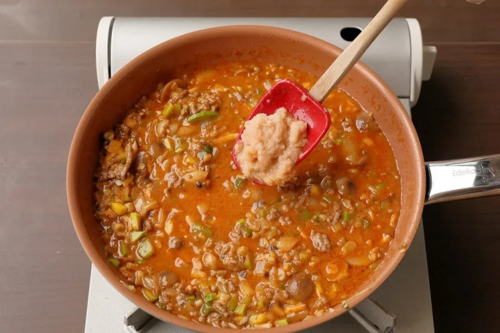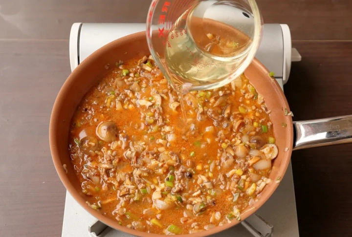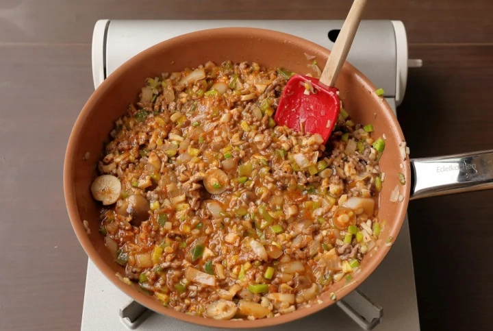 야채가 충분히 익으면 육수 200ml를 붓고 끓여주세요.
