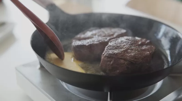 [재료]: 소고기 400g, 소금 1작은술, 후추 약간, 올리브오일 3큰술, 버터