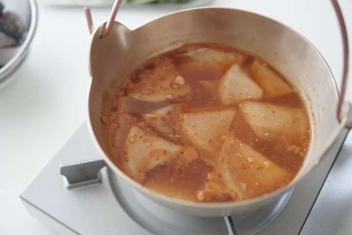 양념장을 넣어 골고루 풀어지면 무를 넣고 끓여주세요.