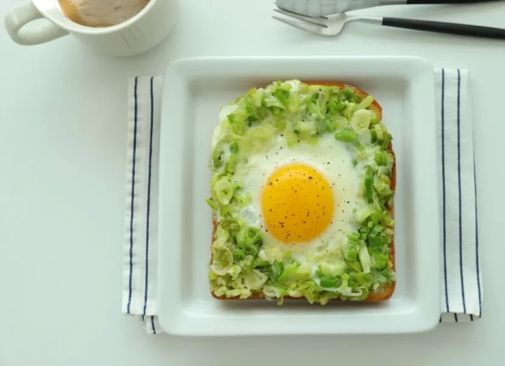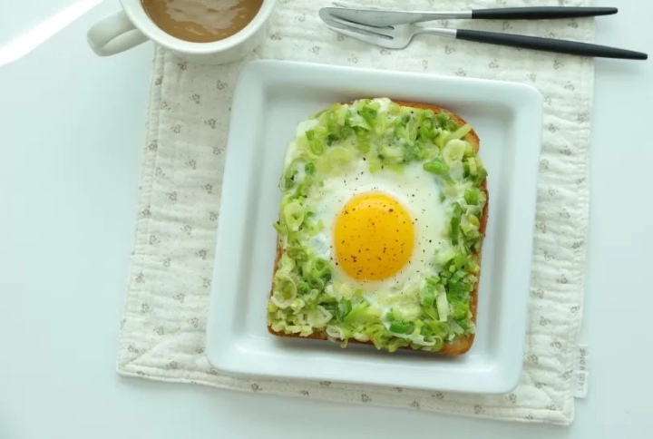 대파를 식빵 모양으로 잡아주고 가운데에 달걀을 넣어 익혀주세요.