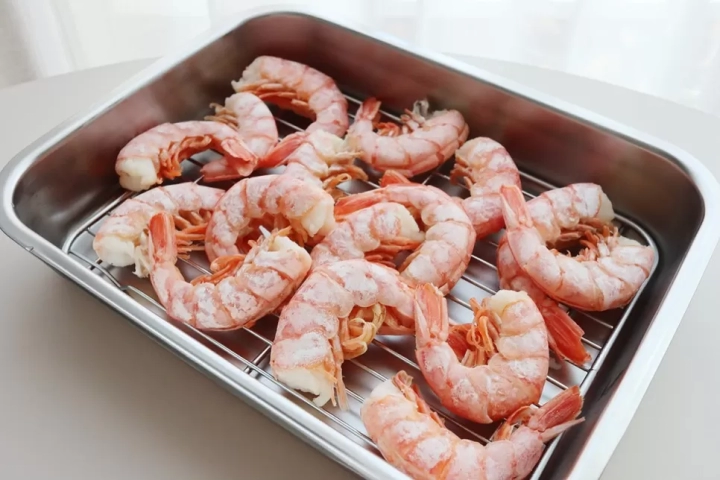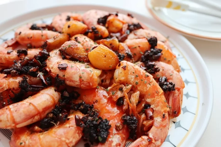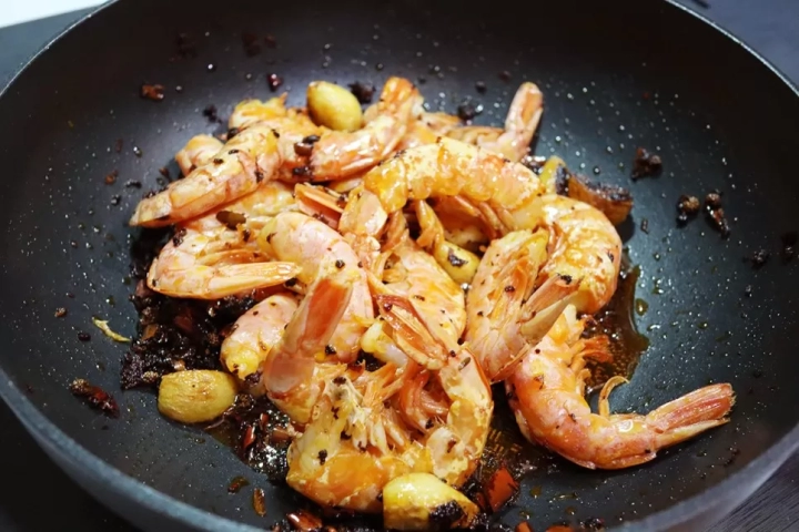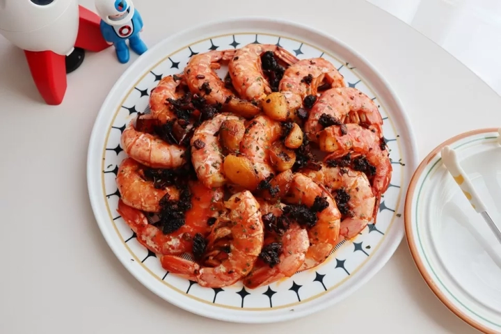 [재료]: 새우 300g, 통마늘 8개, 설탕 1/2큰술,