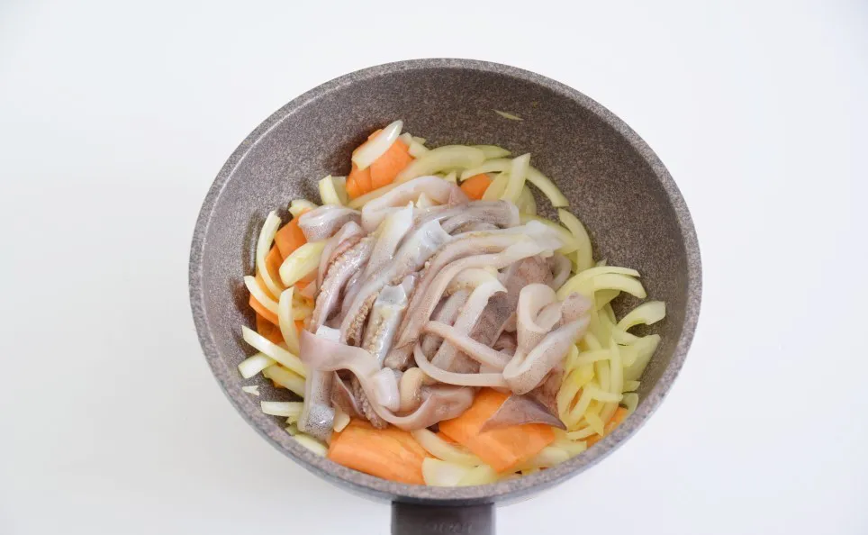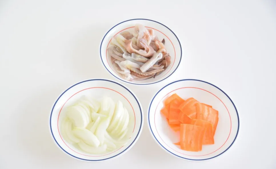 [재료]: 오징어 400g, 양파 1/2개, 당근 1/5개, 대파 1/2대
