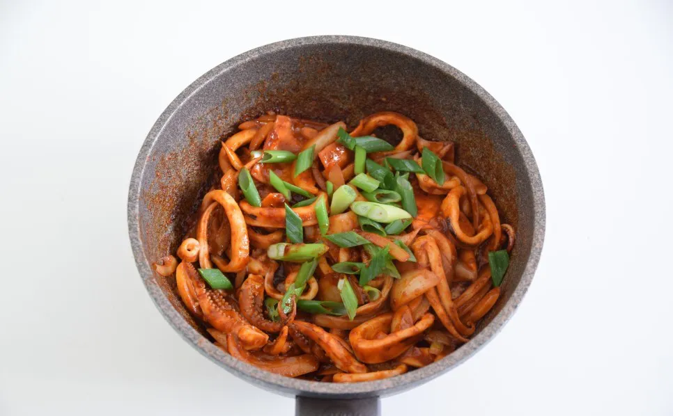 오징어가 살짝 오그라들기 시작하면 양념장을 넣고 빠르게 볶아주세요.