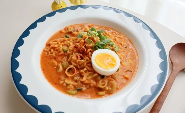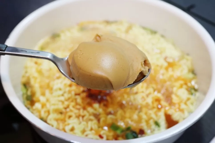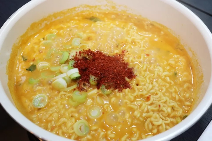 [재료]: 라면 1봉, 땅콩버터 1큰술, 물 400ml, 고춧가루 1큰술, 대파 1/2대