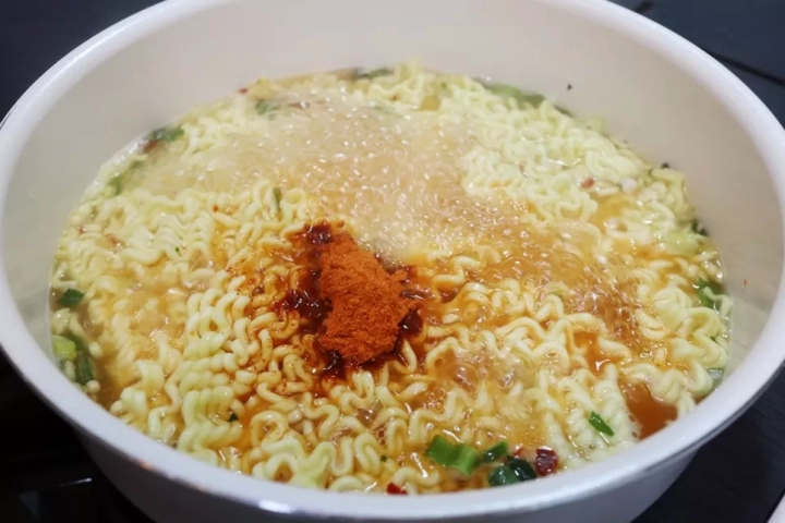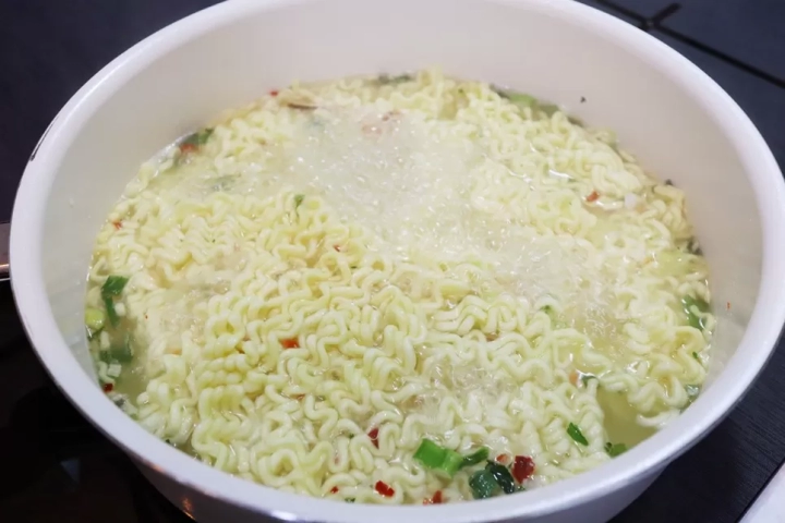 물이 끓어오르면 면과 건더기 스프를 넣어 끓여주세요.
