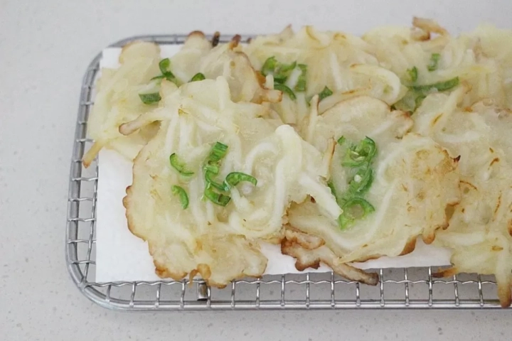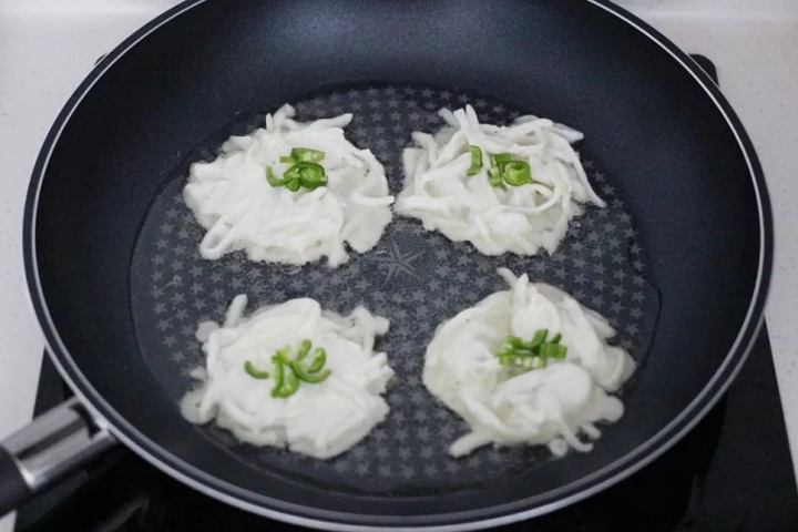 [재료]: 진미채 100g, 부침가루 100g, 물 1컵, 고추 1개