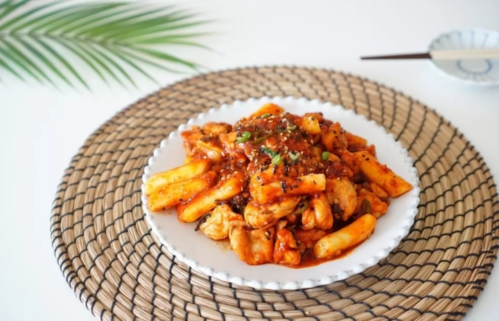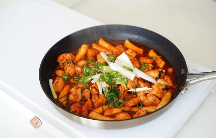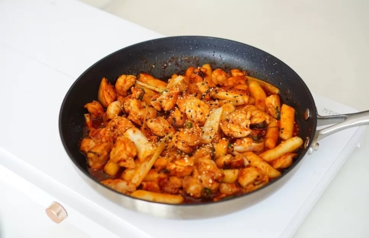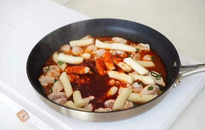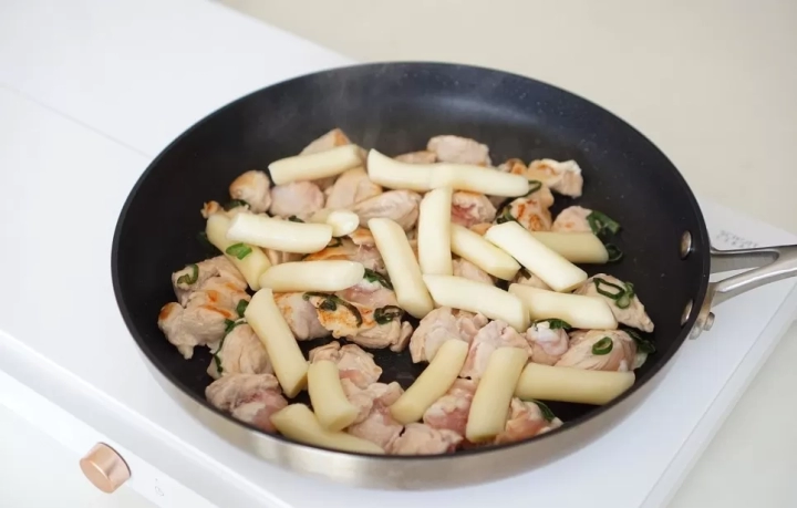 닭고기가 앞뒤로 노릇노릇하게 익으면 떡을 넣어주세요.