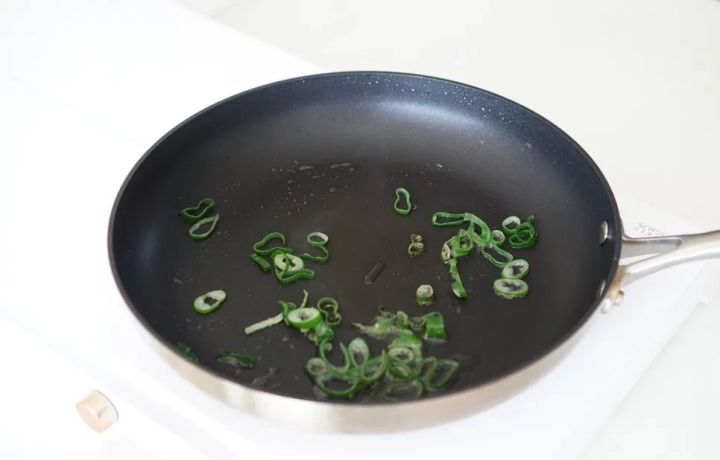중불로 달군 팬에 기름을 둘러주고 대파를 넣고 볶아주세요.
