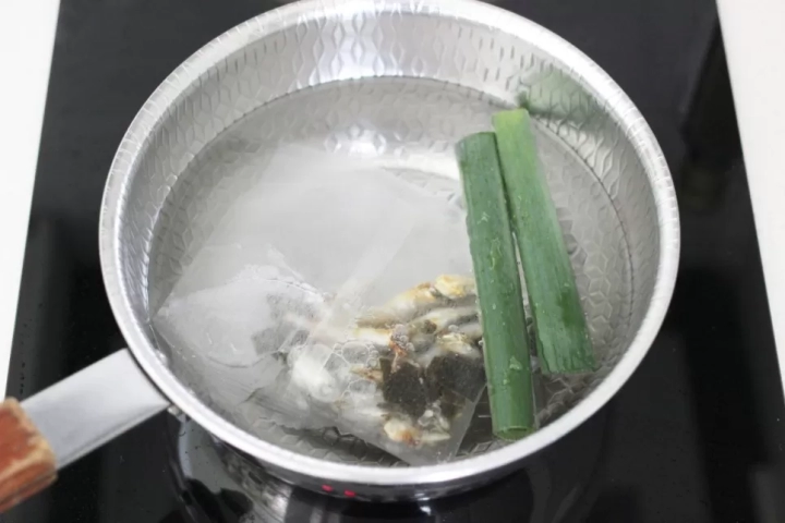 물 600ml에 다시팩1개, 대파 푸른 부분을 넣고
