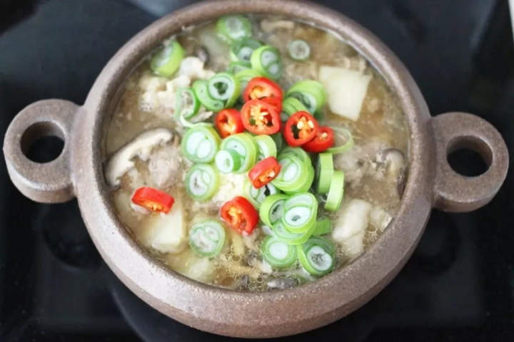 마무리로 대파, 고추 넣어 한소끔 끓여주면 완성~