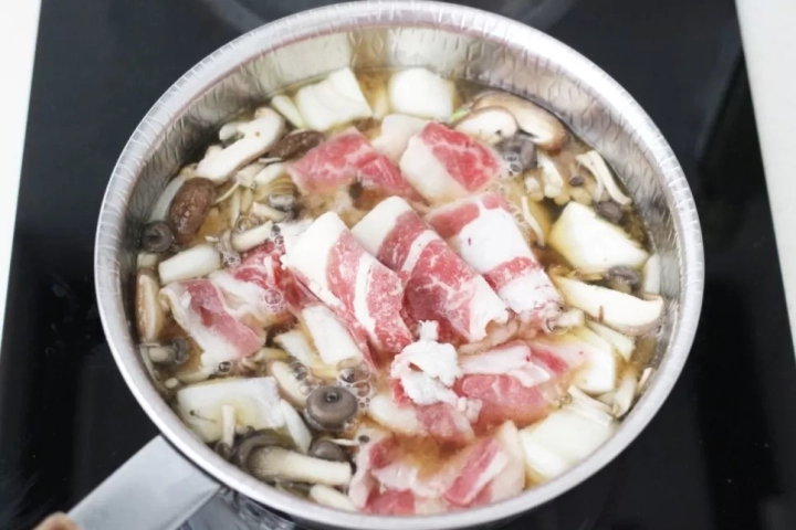 [재료]: 우삼겹 200g, 감자 1개, 양파 1/2개, 버섯 한줌,
