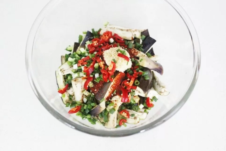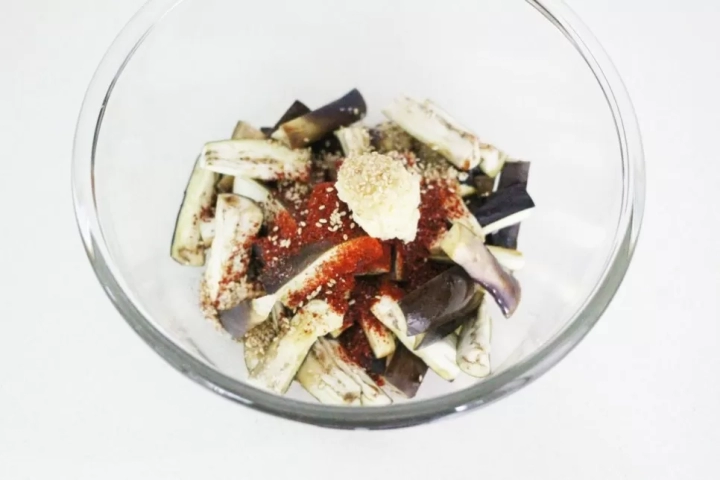 쪄낸 가지에 양념재료들을 모두 넣어주세요.