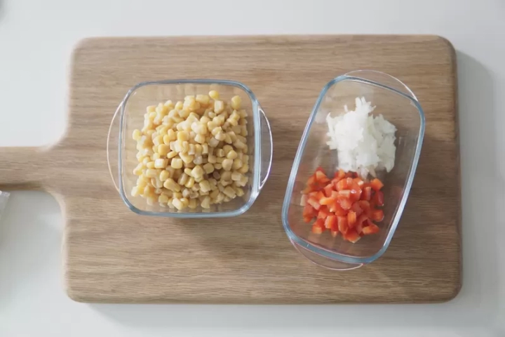 옥수수, 파프리카, 양파를 그릇에 담아주고