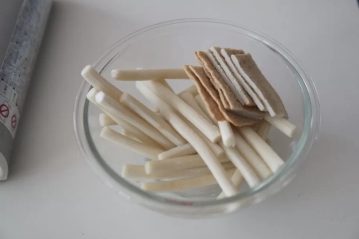 [재료]: 떡볶이떡 300g, 어묵 2장, 멸치육수 600ml, 대파 1대