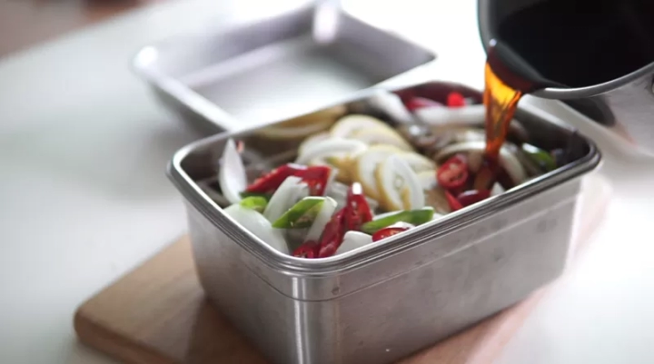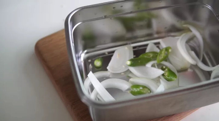 용기 제일 밑부분에 양파와 고추를 일부 담아주세요.