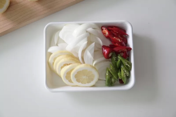 마무리로 남은 양파와 고추, 레몬을 담아주고
