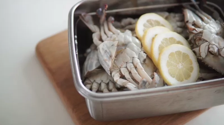 [재료]: 꽃게 3KG, 양파 1개, 레몬 1개, 청양고추 5개