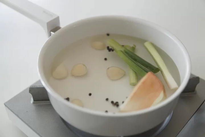 냄비에 대파, 양파, 마늘, 통후추, 청주를 넣고