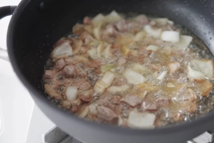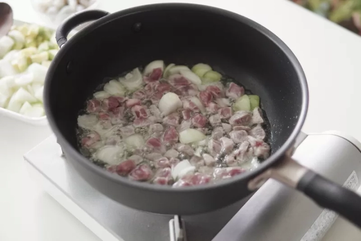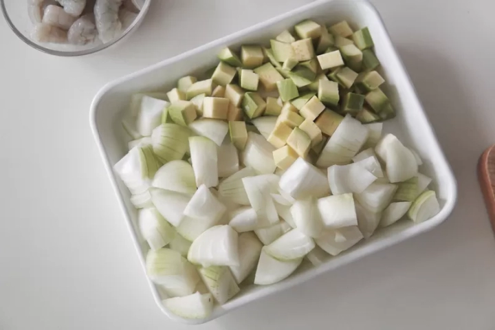 [재료]: 돼지고기 100g, 새우 1컵, 양파 2개,
