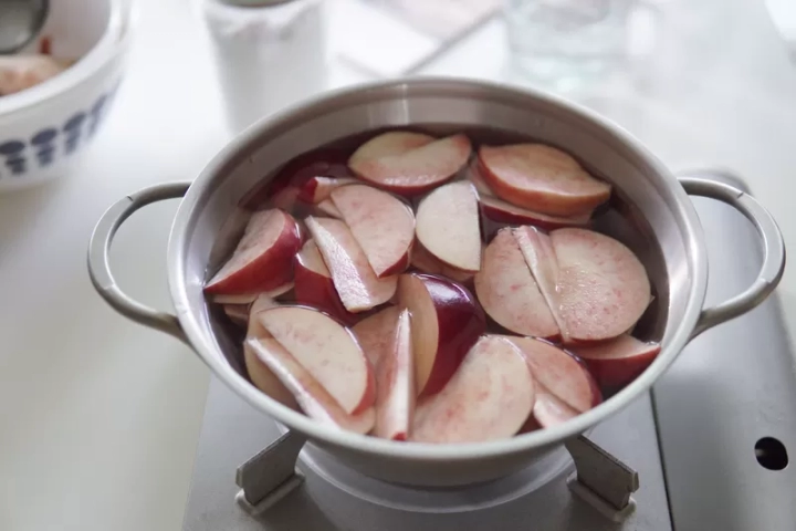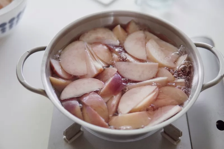 냄비에 복숭아와 물을 넣고 끓여주세요.