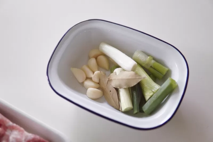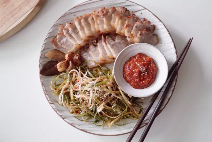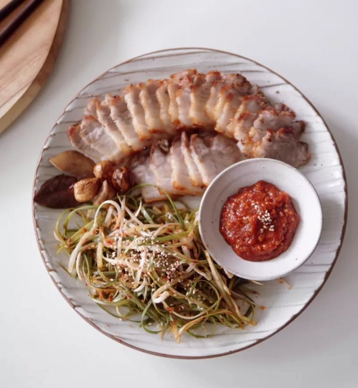 [재료]: 통삼겹 600g, 대파 1대, 통마늘 한줌,