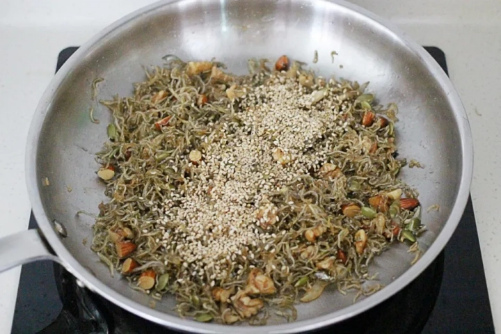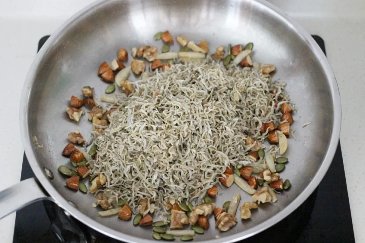 견과류가 바삭해지면 멸치를 더해 볶아주세요.
